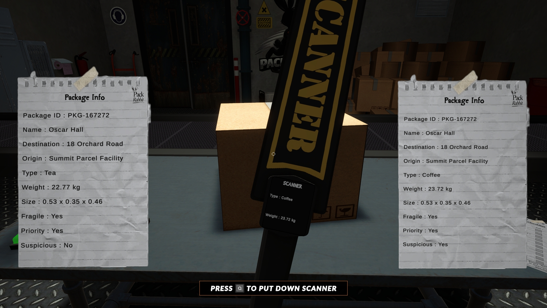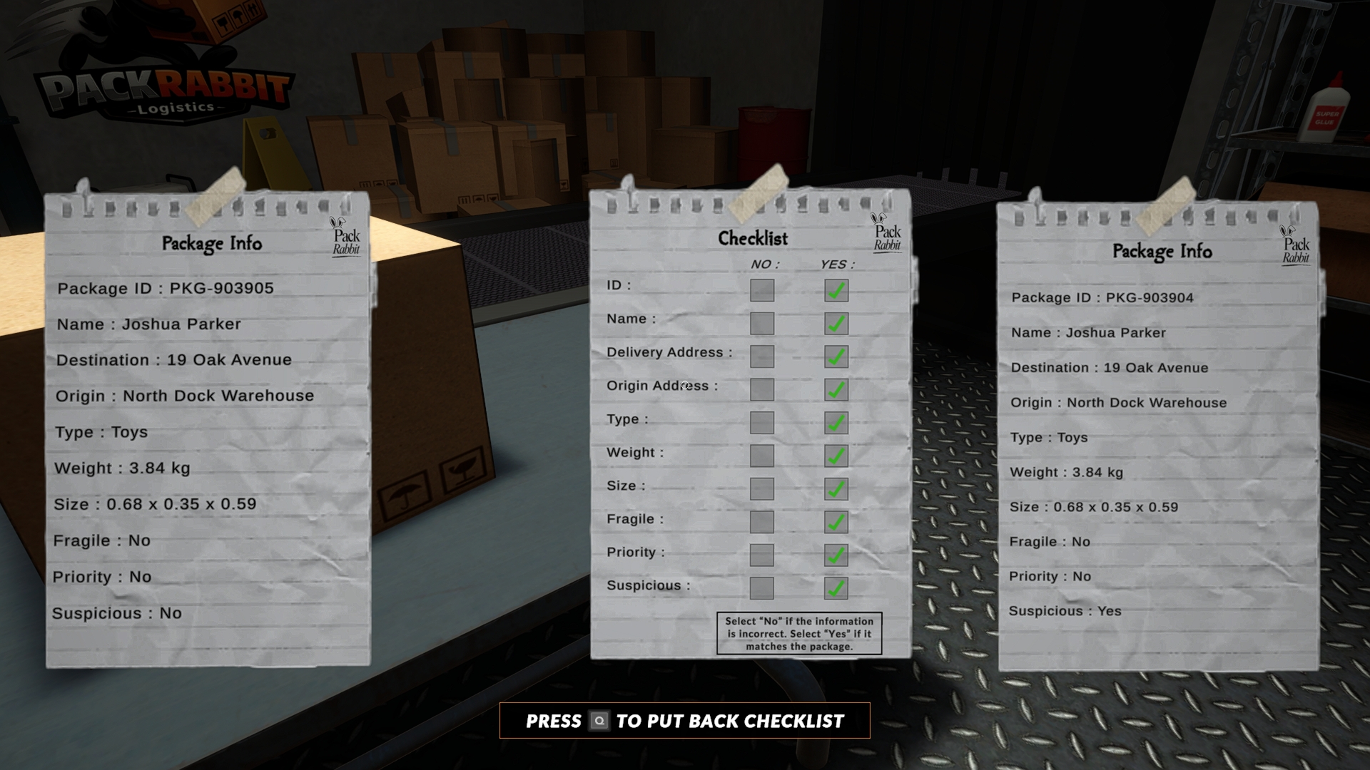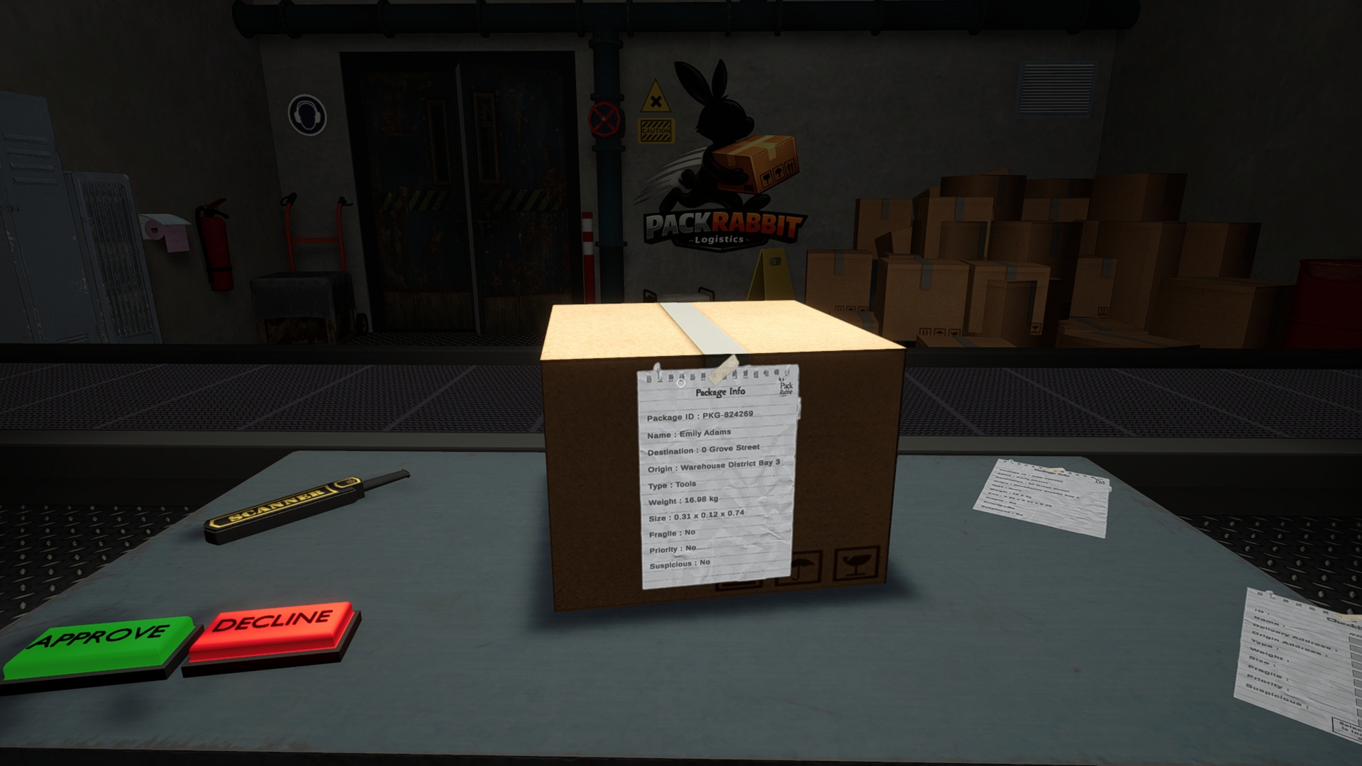 In Packrabbit : Suspicious Cargo, you take on the role of a warehouse inspector responsible for checking incoming parcels. Scan shipments, verify their contents, and decide whether to approve or reject them.